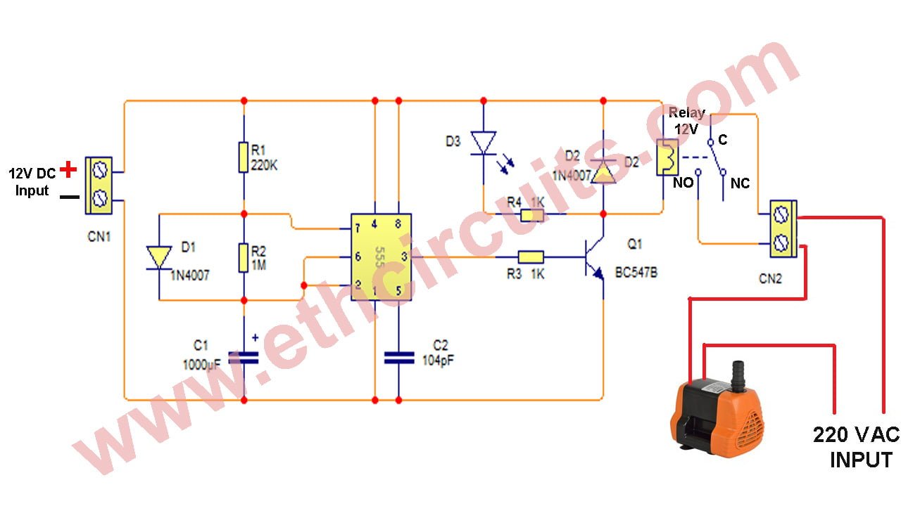 The circuit is completely automatic which starts the pump motor when the water level in the over head tank goes below a preset level and switches off the pump when the water level in the over head tank goes above the full level. 220 k ohm & 5.4 k ohm resistors = 1. Q1 base current is too small, less than 1 micro amp. This is an automatic water pump controller circuit diagram using an ne555 timer. In the countryside, water is very important.